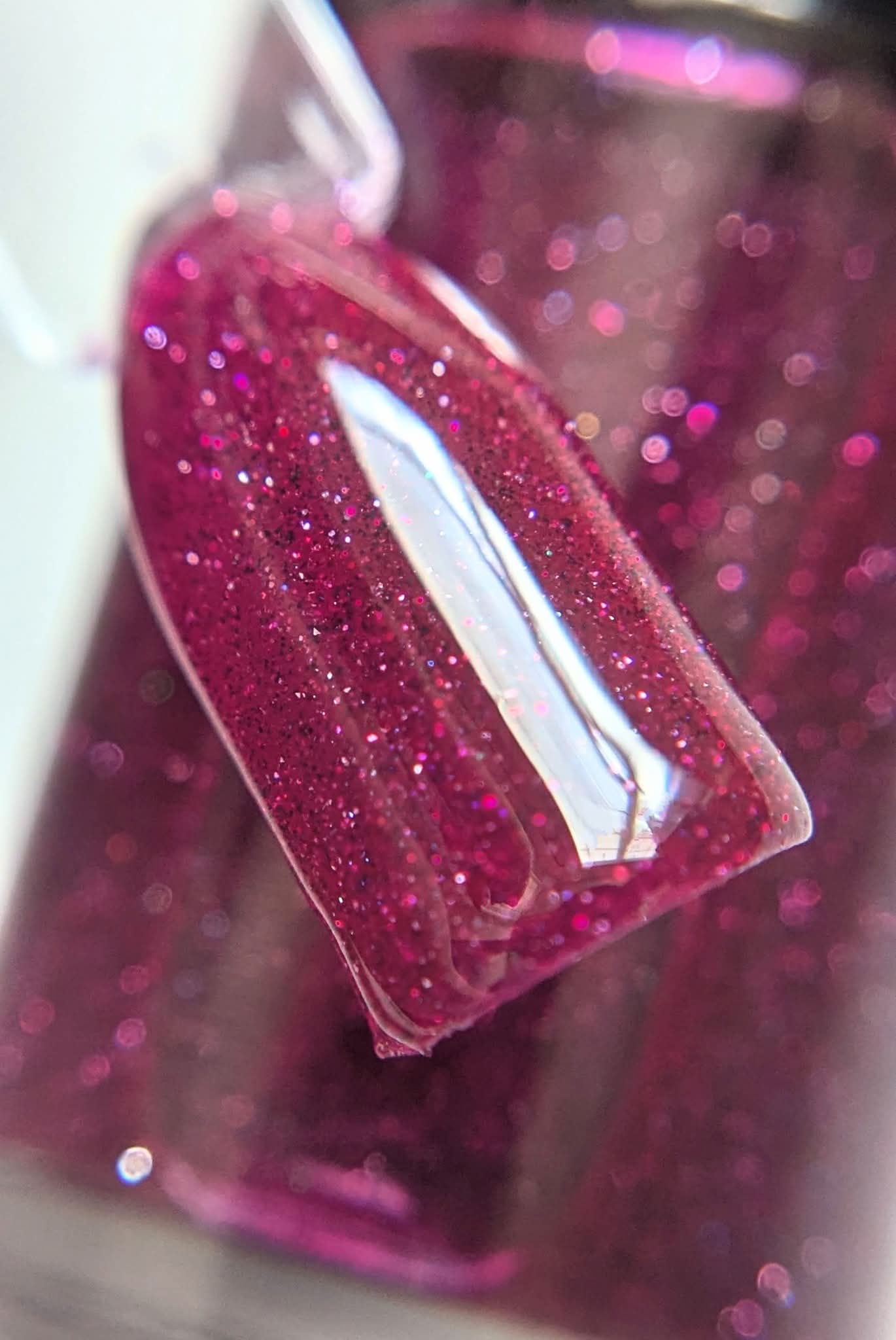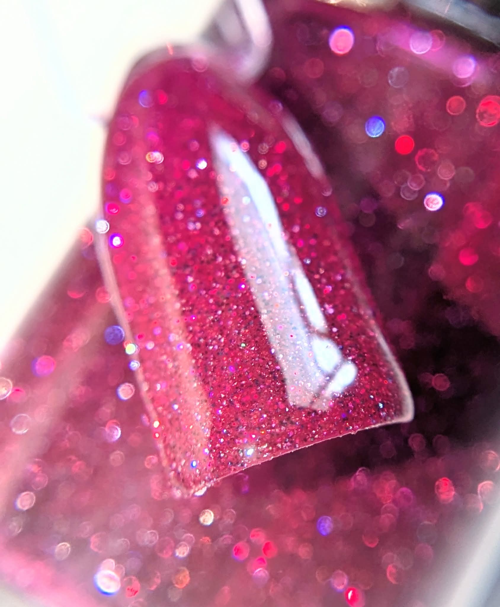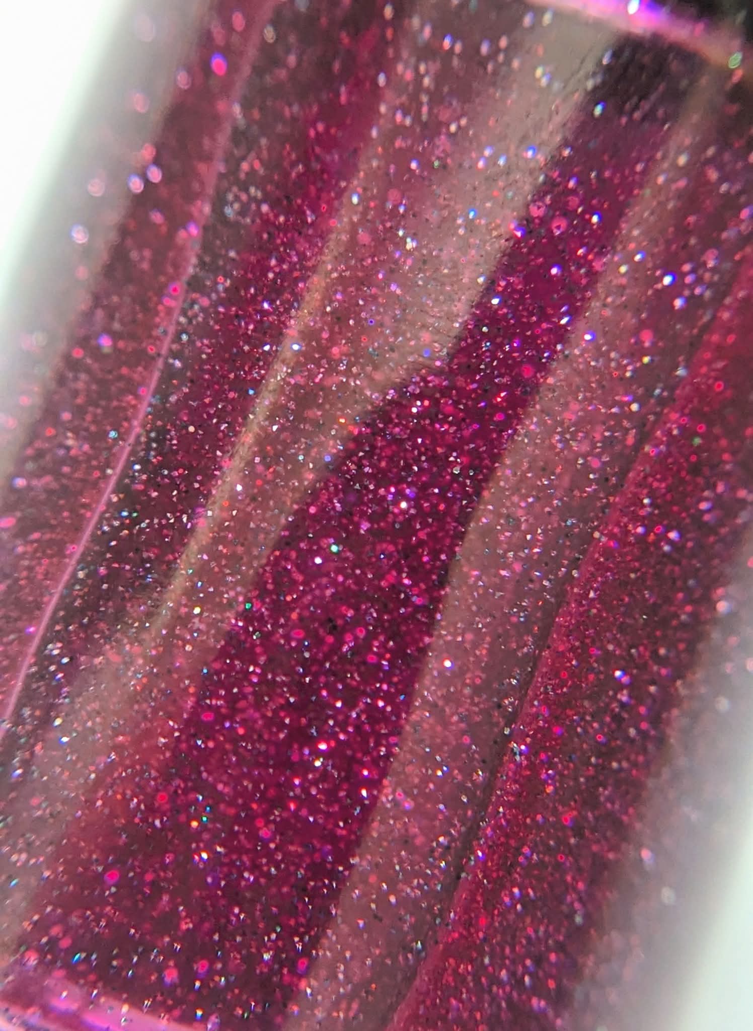 This is a medium/dark magenta filled with reflective glitter that flashes silver, pink and blue.