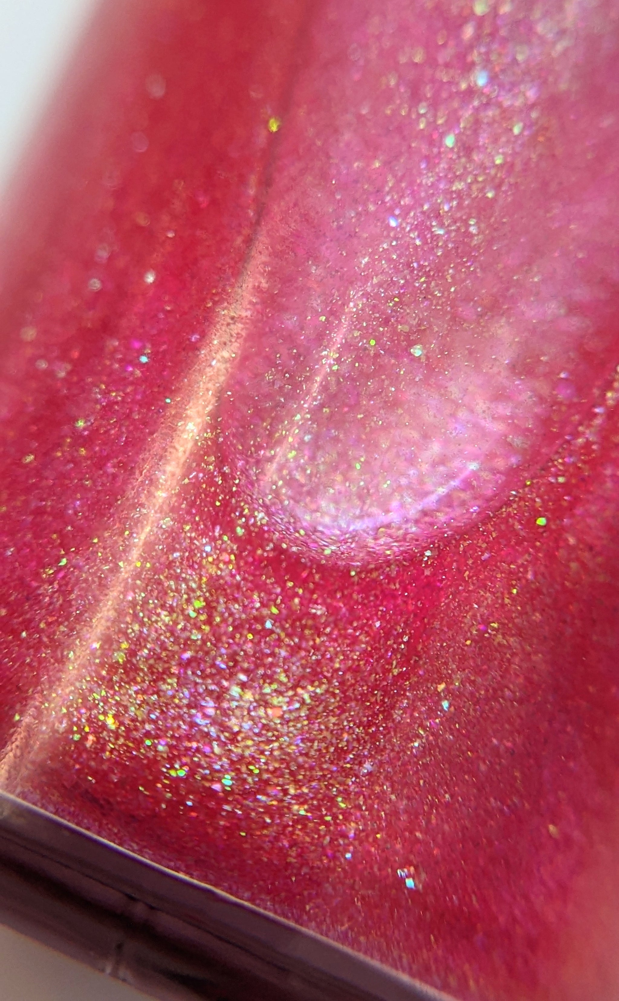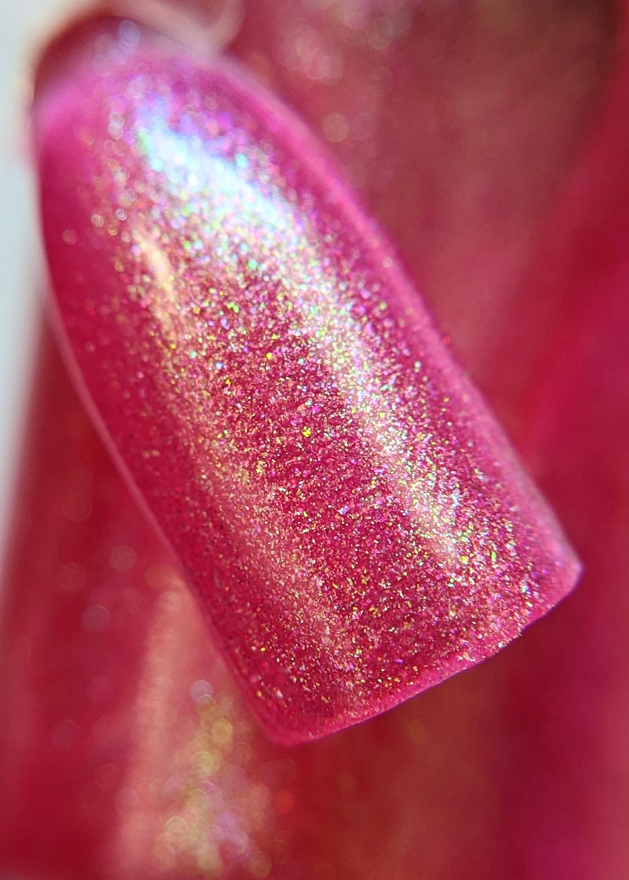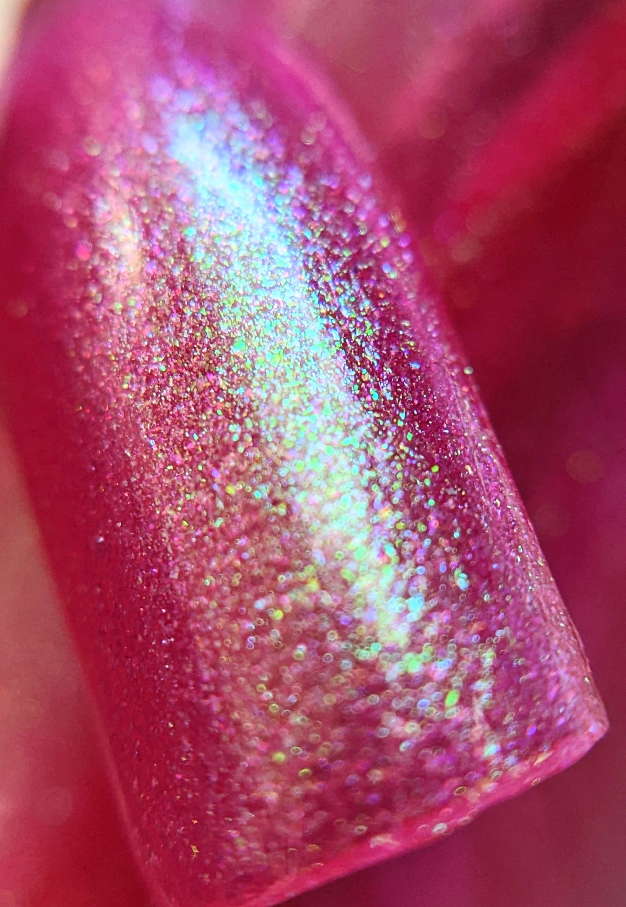 Beautiful pink based polish with green shimmer and a subtle orange hint.