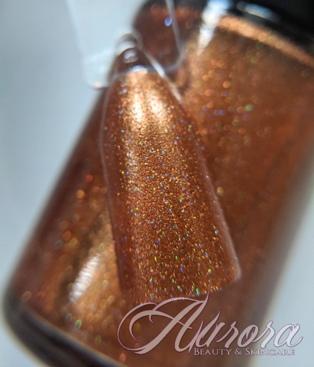 Aunque se llama "Edad de Bronce", es más bien de color cobre. Es muy brillante, con un toque de escamas anaranjadas y mucho brillo holográfico fino.